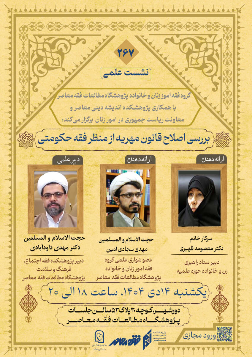 نشست علمی امکان سنجی تاسیس قاعده ترجیح جنسیتی در فقه با تاکید بر فقه حکمرانی یکشنبه هفتم بهمن ماه به همت گروه فقه امور زنان و خانواده پژوهشگاه مطالعات فقه معاصر برگزار برگزار شد.