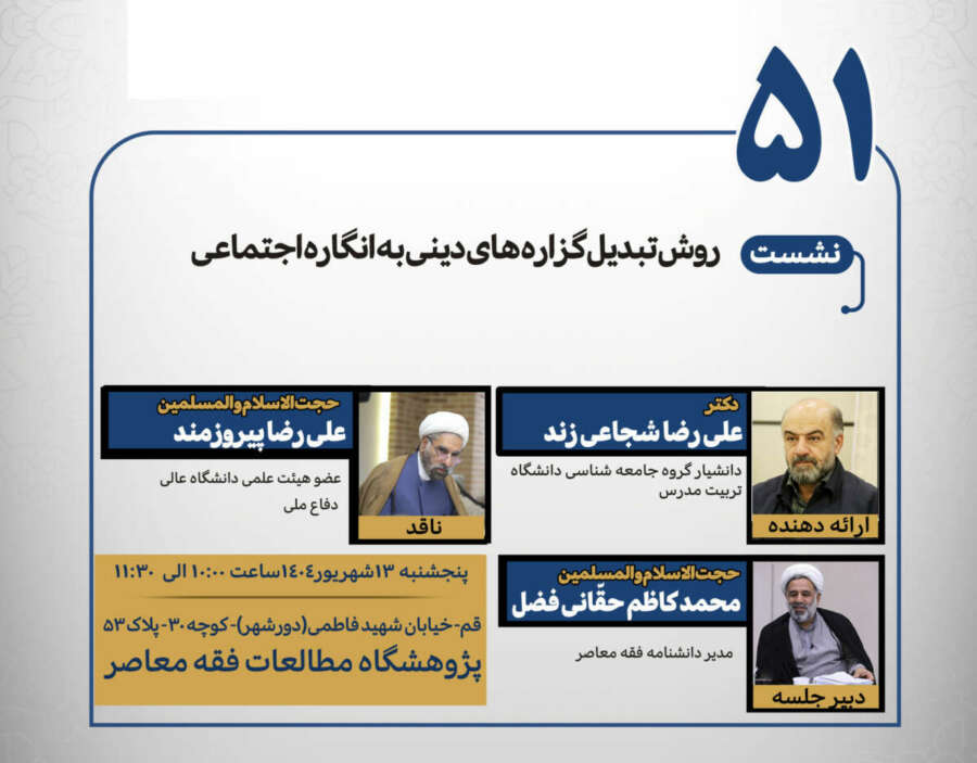 پنجشنبه ۱۳ شهریور ۱۴۰۴، پژوهشگاه مطالعات فقه معاصر با همکاری میز توسعه و توانمندسازی علوم اسلامی دفتر تبلیغات اسلامی، نشست علمی «روش تبدیل گزارههای دینی به انگارههای اجتماعی» را در قالب دوره تابستانه «یکشنبههای روش» برگزار کرد. این جلسه که پنجاه و یکمین نشست از این دوره بود، پیشتر قرار بود در یکشنبه ۲۹ تیر ماه ۱۴۰۴ برگزار شود، اما به دلایلی به تاریخ فوق موکول شده است.