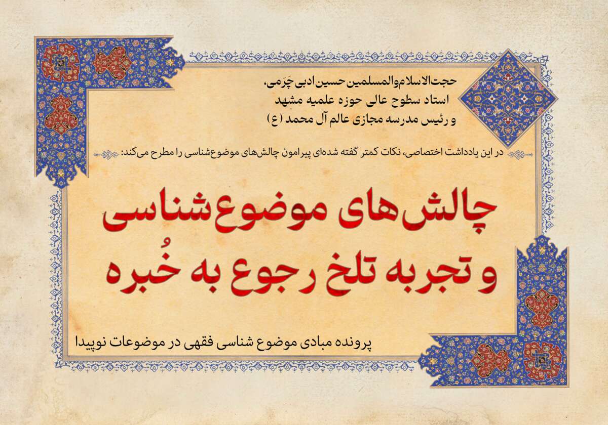 اشاره: موضوعشناسی بهخصوص در موضوعات نوپدید، چالشهای جدیدی را فراروی فقها قرار داده است. از یک سو، امکان فهم همه موضوعات جدید آن هم با تنوع و پیچیدگیهای موجود در آنها، برای یک نفر وجود ندارد؛ و از سویی دیگر، رجوع به خبره نیز تجربه تلخ سوءاستفاده شرکتهای بزرگ از برخی فقها را بهجای گذارده است. حجتالاسلاموالمسلمین حسین ادبی چَرَمی، استاد سطوح عالی حوزه علمیه مشهد و رئیس مدرسه مجازی عالم آل محمد(ع)، در این یادداشت اختصاصی، نکات کمتر گفته شدهای پیرامون چالشهای موضوعشناسی را مطرح میکند: