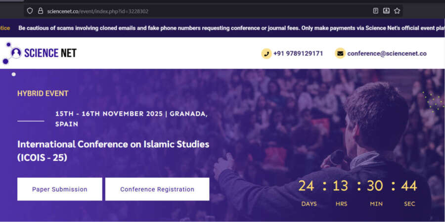 کنفرانس بینالمللی مطالعات اسلامی ۲۰۲۵ (International Conference on Islamic Studies ICOIS‑۲۵) در روزهای ۲۴ و ۲۵ آبان ۱۴۰۴ (۱۵‑۱۶ November 2025) در گرانادای اسپانیا برگزار میشود. این رویداد فرصتی برای گردهمآوردن فعالان حوزه مطالعات اسلامی به منظور ترویج تحقیقات علمی اصیل و تسریع پیشرفت علمی فراهم میآورد. مشخصا بنا بر اعلام برگزارکنندگان، هدف همایش پرداختن به چالشهایی است که مانع توسعه مطالعات اسلامی میشوند. بر این اساس همایش دلمشغول ارائه راهکارهای کاربردی برای ارتقای حوزه اسلام شناسی است.