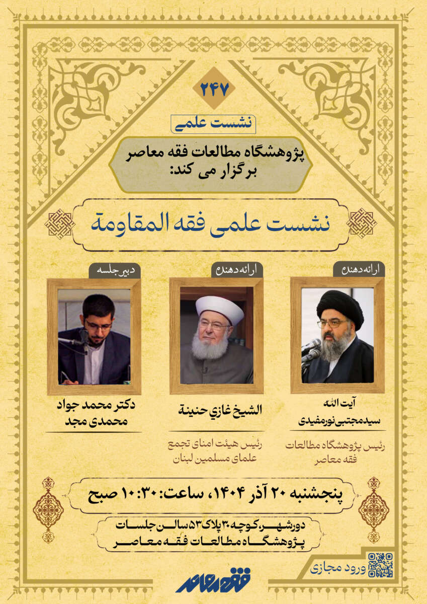 گروه فقه امور زنان و خانواده پژوهشگاه مطالعات فقه معاصر با همکاری معاونت ریاست جمهوری در امور زنان و خانواده و پژوهشکده اندیشه دینی معاصر برگزار میکند: