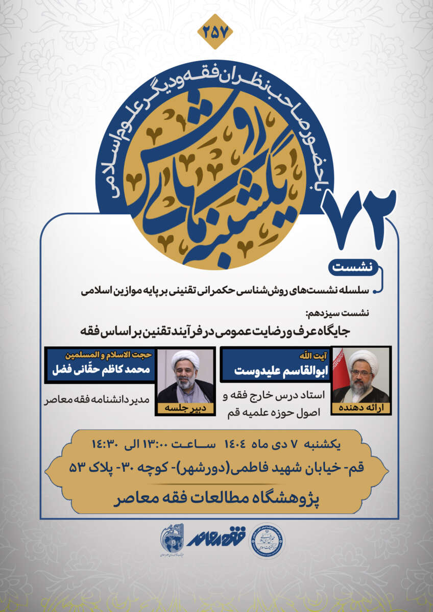 نشست هفتاد و یکم از سلسله نشستهای «یکشنبههای روش» با موضوع «فرایند و روشهای ارزیابی تطابق قانون با ضروريات فقه و مذهب» روز یکشنبه ۳۰ آذرماه ۱۴۰۴ در پژوهشگاه مطالعات فقه معاصر برگزار شد. در این نشست، آیتﷲ محمدجواد فاضل لنکرانی، رئیس مرکز فقهی ائمه اطهار (علیهم السلام) بهعنوان سخنران اصلی به تبیین مبانی قرآنی و فقهی این موضوع پرداخت.