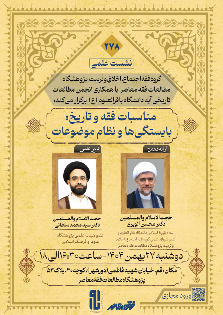 گروه فقه اجتماع، اخلاق و تربیت پژوهشگاه مطالعات فقه معاصر با همکاری انجمن مطالعات تاریخی آیه دانشگاه باقرالعلوم(ع) برگزار میکند: